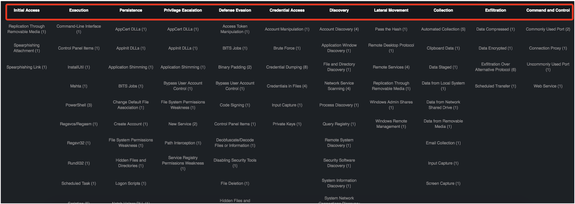 Each column represents a category or tactic (type of attacker behavior); the individual cells represent specific techniques within those categories. To catch a thief, we must think like a thief. Let’s dig into “the plan.”