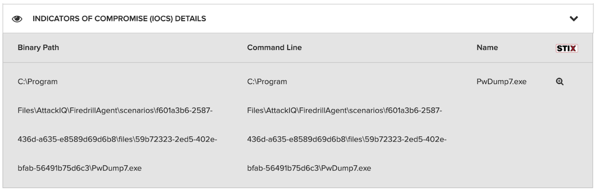 On the AttackIQ platform, after running an assessment you can see the IoC details when you select a test on the results page. Click on any test that has run and you will find a section in the scenario details that shows the Indicators of Compromise (IoC) information. Below, you can see the IoC output for the “Dump Passwords using PwDump7” scenario. Clicking on the little magnifying glass will show you the IoC details in the STIX (Structured Threat Information eXpression) format, which grew out of the need from the security community to share information that characterizes an attack, in a standardized manner.