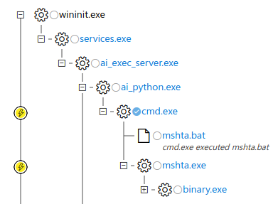 Checking all the information provided in the alert will help us understand what has happened. For instance, in the attached process tree, we see that cmd.exe has been used to run a script named mshta.bat, and that later the binary mshta.exe has been executed, which spawned a new process from the binary.exe file.