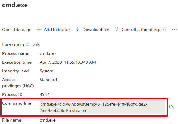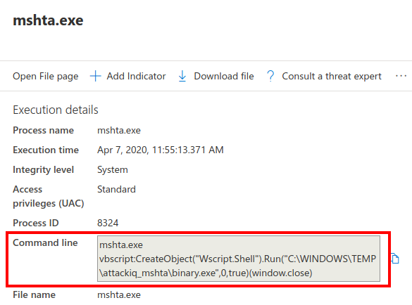 To finish this post, we will show an example of a detection of the Mshta Script scenario with Microsoft Defender ATP, and see how we can infer what the scenario has executed from the information provided by it.