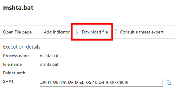 Finally, if we want to see the whole contents of the script mshta.bat or the binary.exe file (for example, to reverse engineer it and understand its functionality), we can download them just by clicking on the “Download file” button: