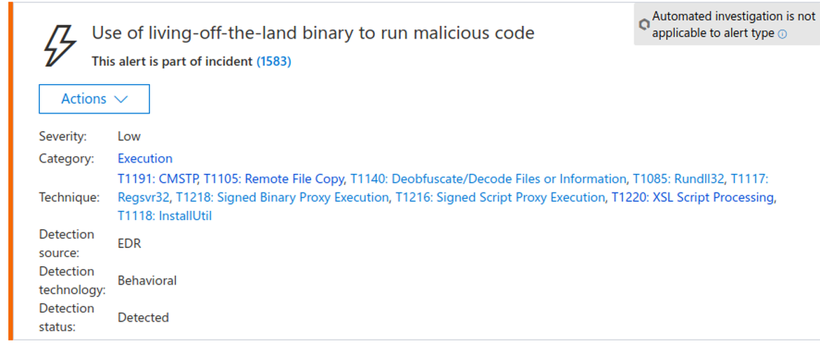 This serves as a first input to know that the security tool has worked as expected without needing to access the dozens of security controls in place to obtain this information. However, if we want to dig deeper we can go to the tool’s interface. Indeed, when logging into Microsoft Defender Security Center, we see that an alert has been triggered for running a living-off-the-land binary: