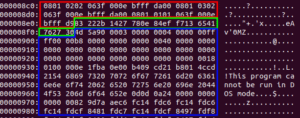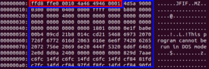 Hex dump of a Windows executable (blue) obfuscated with a JPEG header (red)
