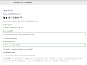 Configuration of the Download File to Memory scenario with a custom obfuscated payload