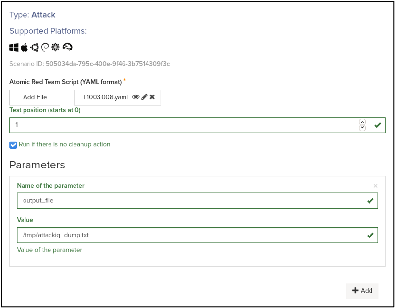 You may notice that this specific test receives an input argument, named “output_file”, the default value of which is “/tmp/T1003.008.txt”. The AttackIQ scenario allows you to change the value of input arguments through the Parameters section of the configuration. Simply specify “output_file” under Name of the parameter and your desired value under Value (e.g. “/tmp/attackiq_dump.txt”).