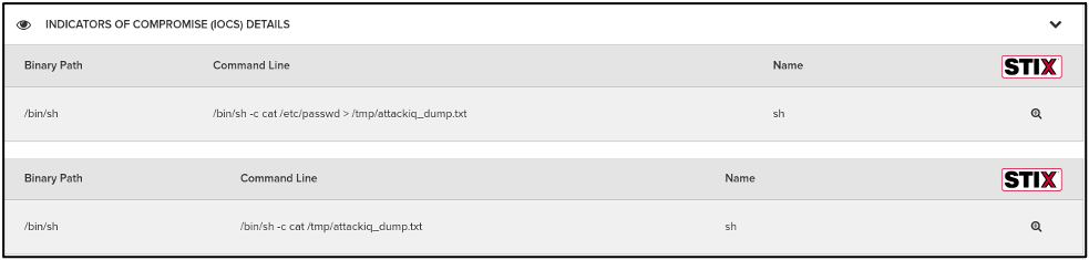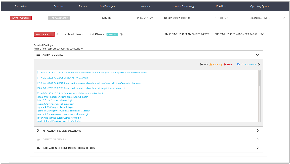 As with any other scenario, under the Indicators of Compromise (IOCs) Details section, you can see the details of all the commands executed by the test. Notice how the custom parameter you configured for “output_file” was used in the commands: