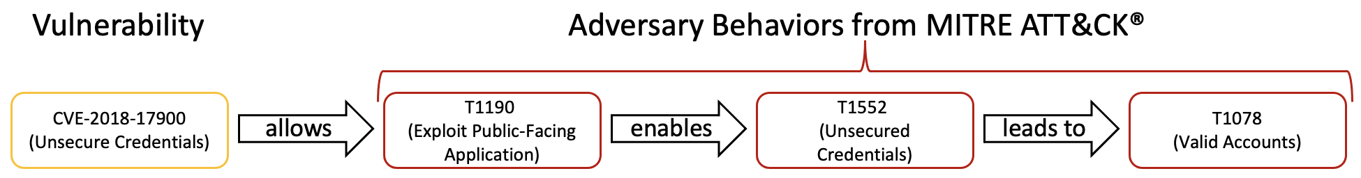 In this graphic, the attacker begins with the known vulnerability of “unsecure credentials” (CVE-2018-17900). This vulnerability allows the attacker to use the ATT&CK tactic Exploiting a Public Facing Website (Tactic 1190) which then enables the attacker to use the tactic of Unsecured Credentials (T1552). From there, they can move to Access Valid Accounts (T1078). This logical alignment, outlined in the Center’s research, shows how you can gain a strategic understanding of the adversary by aligning the two frameworks.
