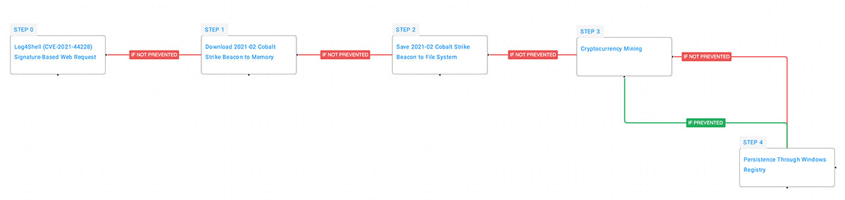 In the example below, we show how you can easily chain together key TTPs using an Attack Flow in the AttackIQ Security Optimization Platform. In using the Anatomic Engine to run an attack flow, you can build collaboration between your red, blue, and purple teams to understand how an attacker might target your organisation, and what steps they take might take after a successful exploitation of Log4Shell. The below example captures some of the known tactics, techniques, and procedures that different threat actors use today in conjunction with Log4Shell to gain entry to vulnerable systems. It has been observed that after successful exploitation, some threat actors download Cobalt Strike to a compromised host, execute a coin miner, and create a persistence method through the Windows Registry.