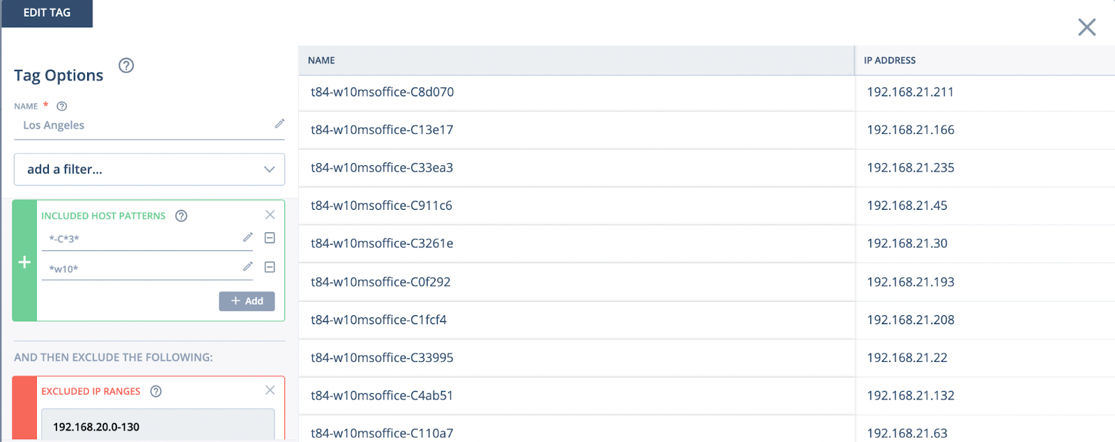 Image: For this example, our Los Angeles tag comprises hosts outside of a specific IP range that match a handful of hostname wildcards. This group will update automatically when new IPs join the allowed range or new hostnames take on the naming convention!