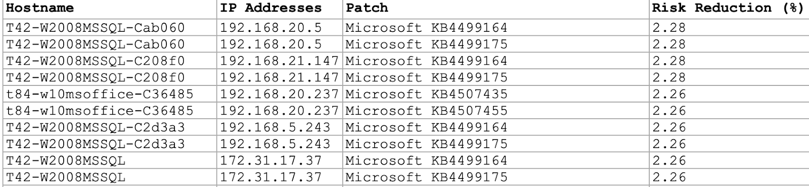 Image: An example from the new Details page, showing patches ordered by Risk Reduction. Identify and prioritize the patches that mitigate the most risk in your environment.