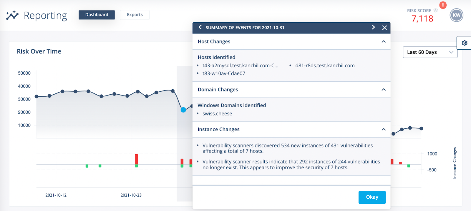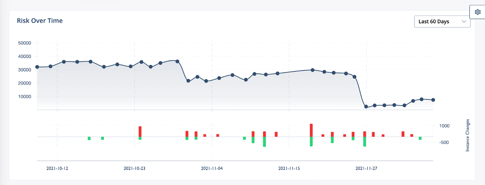 The red and green bars show when new vulnerabilities were discovered in your environment and when vulnerabilities were remediated or otherwise “cleared out” of your model. Typically, you’ll see your Risk Over Time drop when vulnerabilities are mitigated.