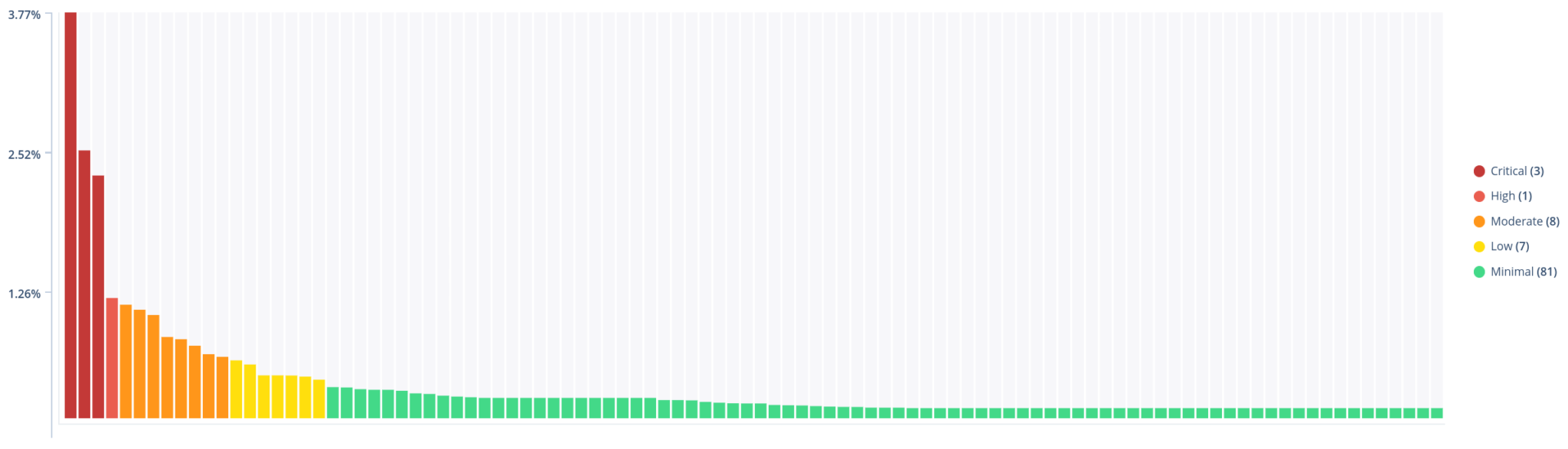 - The results are asymptotic. As you are constantly addressing the most important risks week after week, I can guarantee you will run into a power law distribution where 80% of your risk each week is coming from 20% (or less) of your vulnerabilities. By always picking vulnerabilities off the top of that list, you will drive your total enterprise risk down with the highest possible ROI. Not only that, but you will also drive it down to a plateau and keep it there. This means that when a new, outsized-risk appears on your network (and it will) you’ll spot it easily and know that you need to address it quickly. Using Predictive Vulnerability Management you are no longer looking for risk among noise (needles in haystacks), but you’ll see clear spikes in risk.