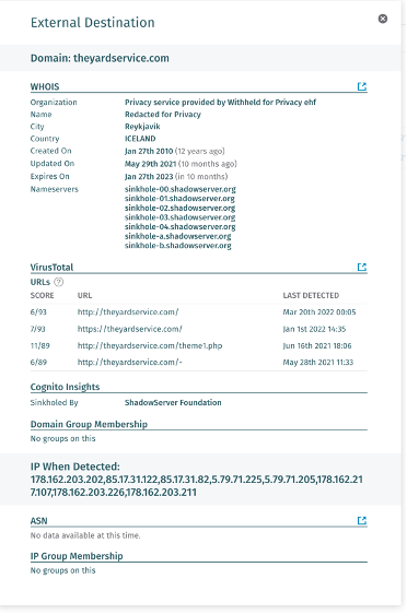 As shown below, we now have a detection correlated with Vectra. The raw event is displayed as well showing the domain, theyardservice[.]com, as present within the event.