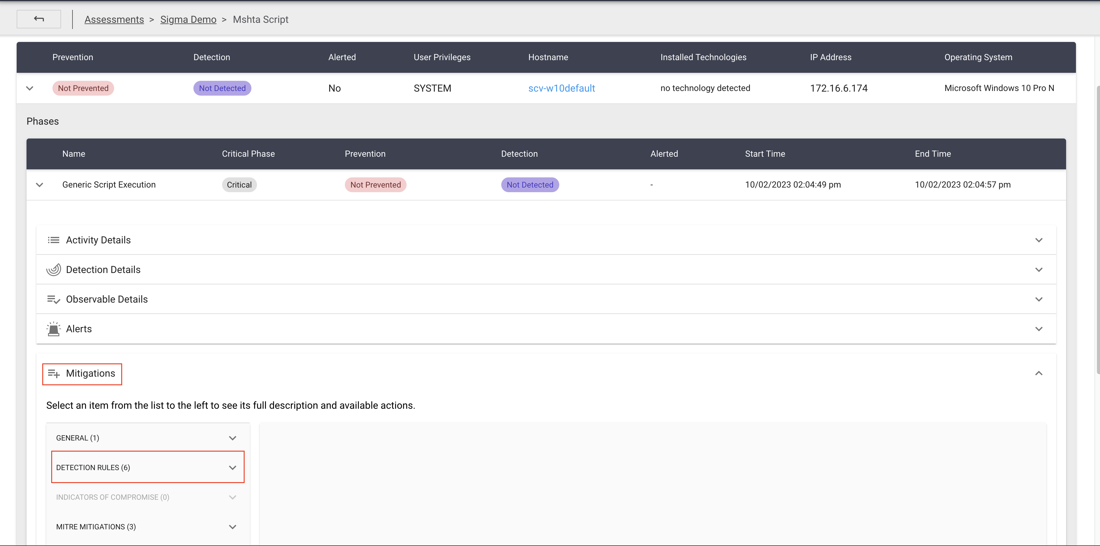 Note, you can also view scenario specific mitigations/detection rules in the main menu on the left side of the screen. After navigating to the Scenarios page, click on an individual scenario, then the Mitigations. In this scenario details mitigations tab, you will see the Detection Rules section on the left.
