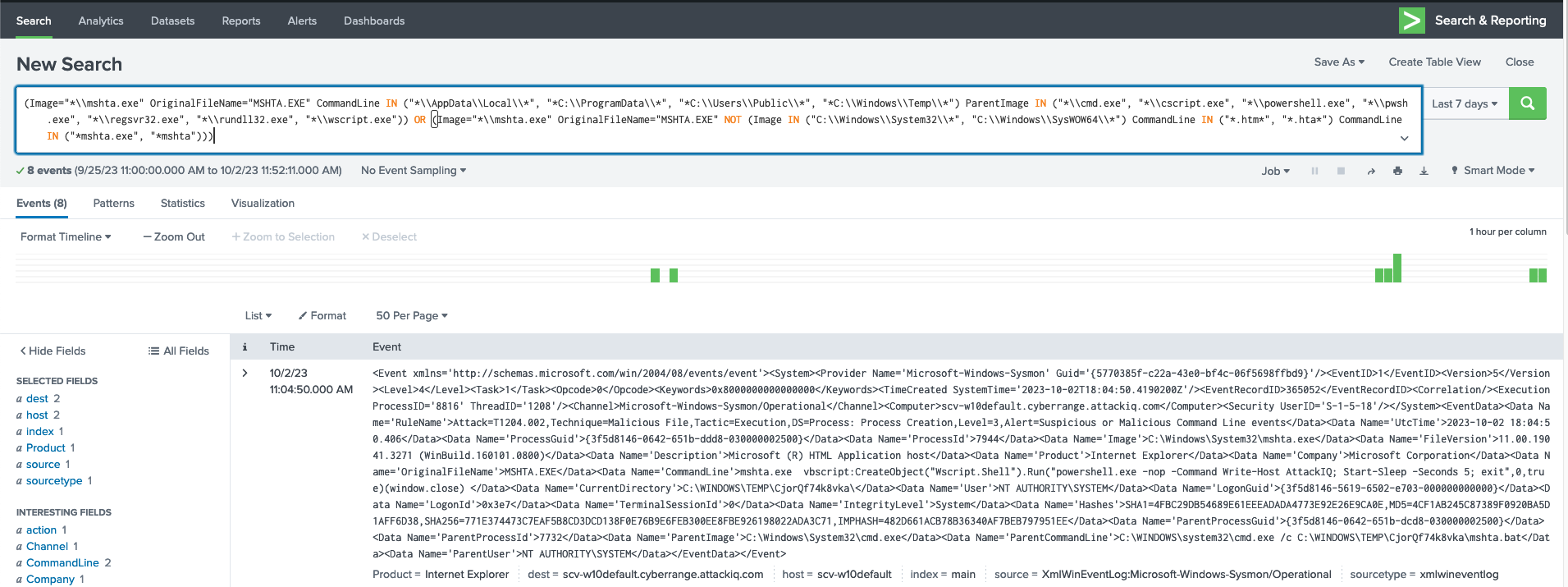 Only eight events were returned for two hosts, one of is the asset we are testing on (note: the time difference is due to timezone display preferences for the Splunk user). All events returned are as a result of AttackIQ testing; in other words, our converted Sigma Rule has returned zero false positives over the past week of data.