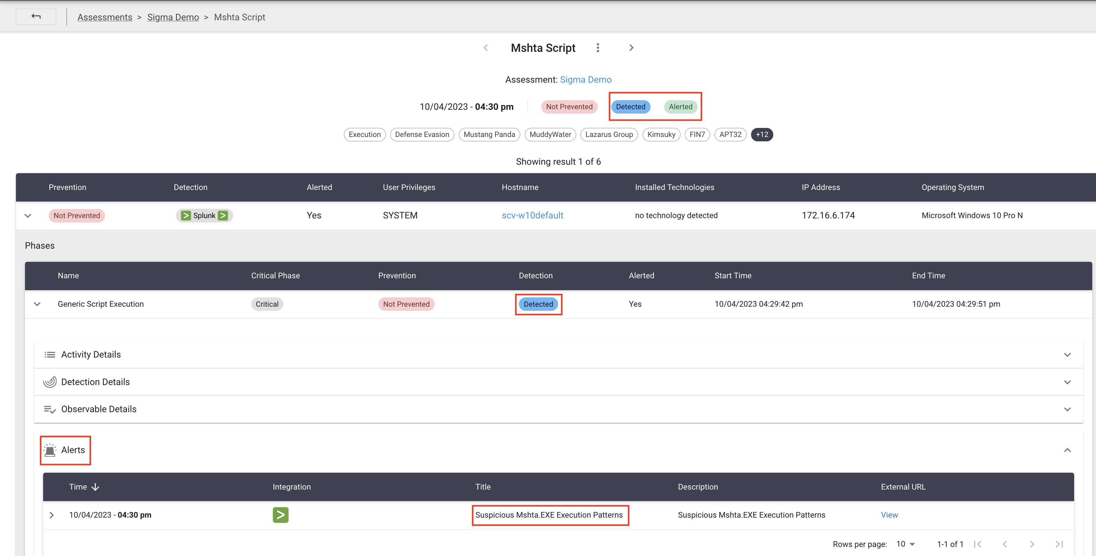 For the purpose of this demonstration, we will be running the scenario “Mshta Script” in an assessment on a Windows 10 asset. We will also be attempting to detect the scenario with the “Splunk ES Stream” integration. Ensure your test asset has Sysmon installed and enabled, or command line process auditing configured, so the required logs are successfully forwarded to Splunk. As seen below, we have already run the assessment, and the scenario was not prevented, and also not detected: