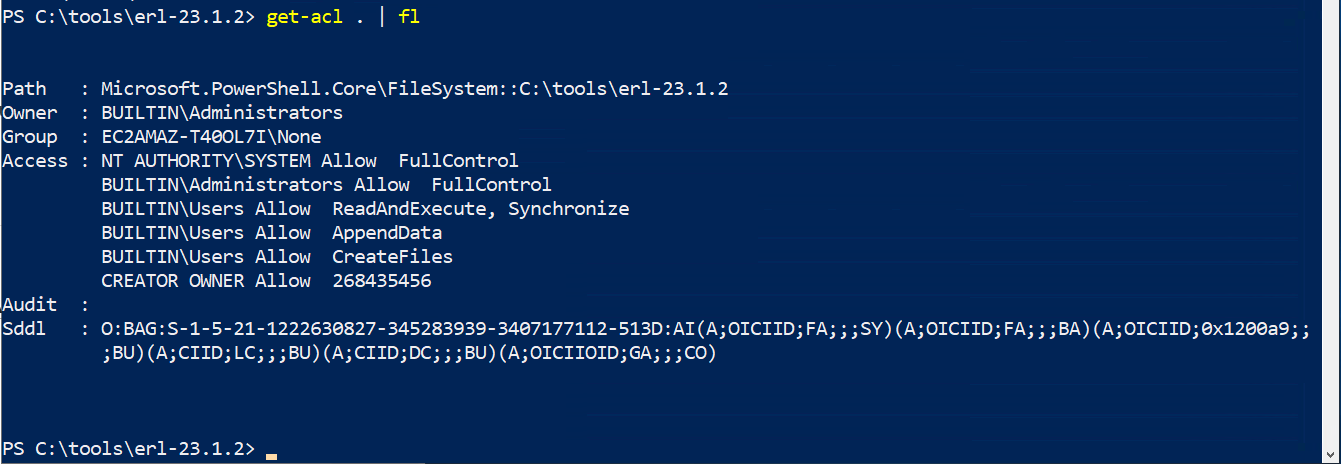 Alternatively, you can see the full permissions list using command line tools, such as “get-acl . | fl“: