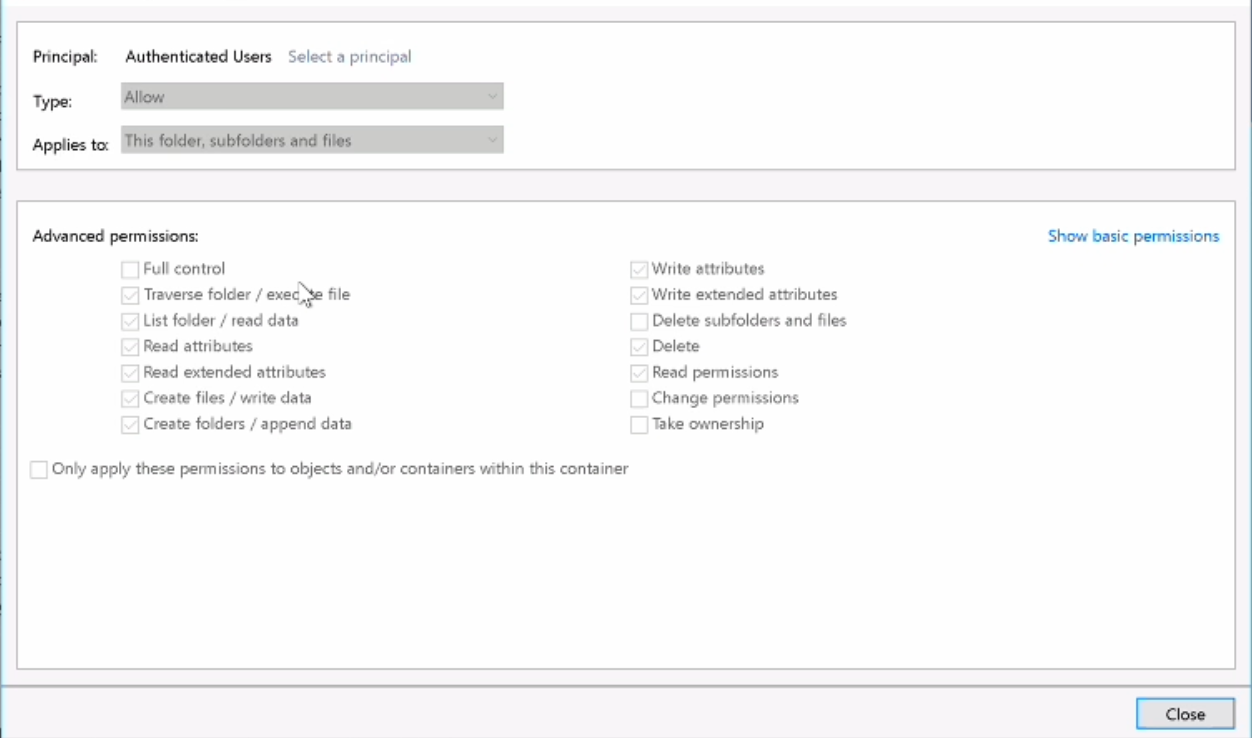 - The permissions on the root folder of any drive grants all local users the ability to append new files.