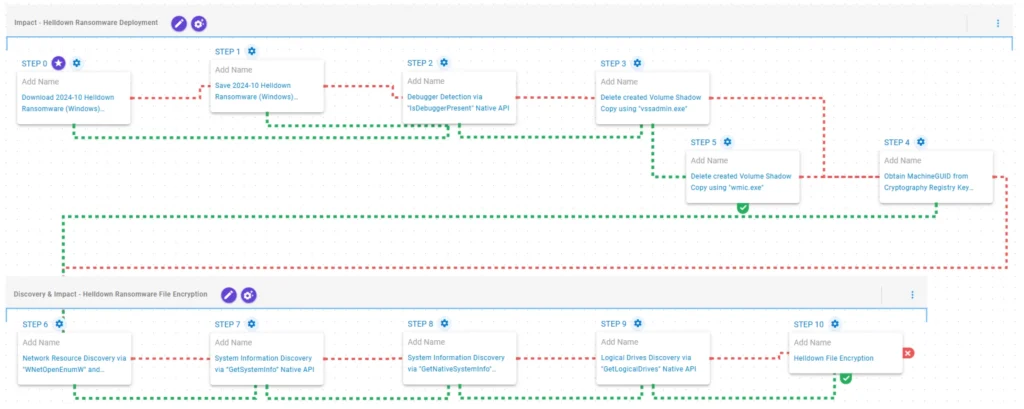 Data Encrypted for Impact (T1486): This scenario performs the file encryption routines used by common ransomware families. Files matching an extension list are identified and encrypted in place using similar encryption algorithms as used by Helldown ransomware.
